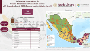 Con una primera detección, Jalisco se suma a las trece entidades en las que se ha registrado presencia del gusano barrenador del ganado (GBG) en territorio mexicano. El Servicio Nacional de Sanidad, Inocuidad y Calidad Agroalimentaria (Senasica) reporta, al 5 de noviembre, 757 casos activos distribuidos en nueve estados del país, 85 más respecto a la cifra de hace un mes (semana epidemiologica 40), cuando se notificaron 672.