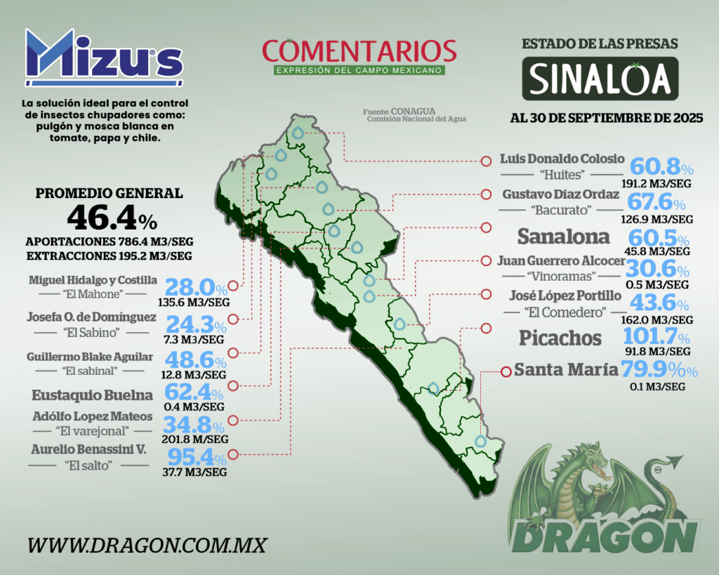 Culiacán, Sin., 30 de septiembre de 2025._ Las presas de Sinaloa se encuentran al 46.4% de su capacidad de almacenamiento con 786.4 m3/seg de aportaciones y extracciones de 196.2 m3/seg, considerando el trasvaso de la Luis Donaldo Colosio a Miguel Hidalgo por 139.7 m3/seg y Miguel Hidalgo a Josefa Ortíz de Domínguez por 8.0 m3/seg.